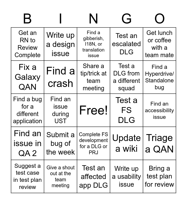 This bingo card has a free space and 24 words: Submit a bug of the week, Give a shout out at the team meeting, Share a tip/trick at team meeting, Suggest a test case in test plan review, Get lunch or coffee with a team mate, Get an RN to Review Complete, Fix a Galaxy QAN, Write up a design issue, Test a FS DLG, Complete FS development for a DLG or PRJ, Test a DLG from a different squad, Find a bug for a different application, Update a wiki, Triage a QAN, Find a crash, Write up a usability issue, Find an accessibility issue, Find a gibberish, I18N, or translation issue, Find a Hyperdrive/ Standalone bug, Find an issue during UST, Bring a test plan for review, Find an issue in QA 2, Test an escalated DLG and Test an affected app DLG.