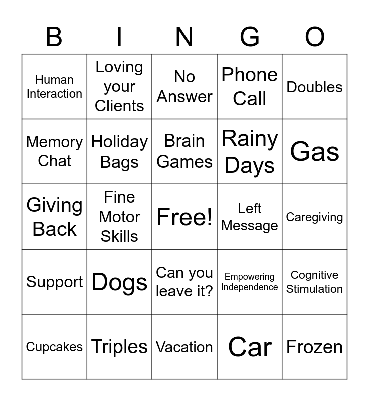 This bingo card has a free space and 43 words: Meals, Frozen, Box, Cupcakes, Bread, Car, No Answer, Return to Center, Doubles, Triples, Phone Call, Left Message, Can you leave it?, Dogs, Doc Appt, Vacation, Sub, Giving Back, Making a Difference, Gas, Loving your Clients, Honoring Parents, Fingerprints, Human Interaction, Well-Check, Caregiving, 5 pack, 2 pack, Empowering Independence, Support, Companionship, Cognitive Stimulation, Reduce Isolation, Fine Motor Skills, Singalong, Music Appreciation, Pet Therapy, Brain Games, Memory Chat, Rainy Days, Inclement Weather, Holiday Bags and Angel Tree Gifts.
