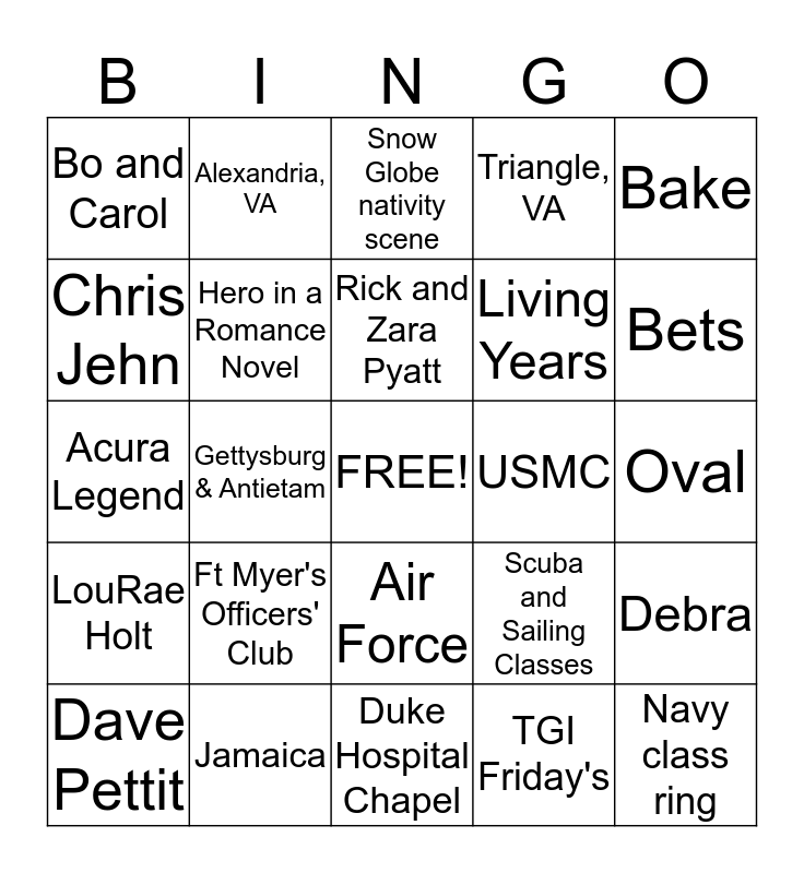 This bingo card has a free space and 24 words: Ft Myer's Officers' Club, Jamaica, Rick and Zara Pyatt, Dave Pettit, Bake, Bo and Carol, Chris Jehn, Alexandria, VA, USMC, Air Force, Living Years, Acura Legend, Scuba and Sailing Classes, Debra, Hero in a Romance Novel, TGI Friday's, Oval, Snow Globe nativity scene, Bets, Gettysburg & Antietam, Navy class ring, LouRae Holt, Triangle, VA and Duke Hospital Chapel.