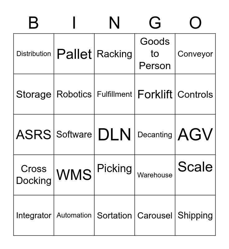 This bingo card has a free space and 24 words: WMS, Automation, Fulfillment, Integrator, Conveyor, Distribution, Storage, Pallet, Decanting, Picking, Forklift, ASRS, Warehouse, Scale, Robotics, Carousel, AGV, Racking, Controls, Software, Shipping, Cross Docking, Goods to Person and Sortation.