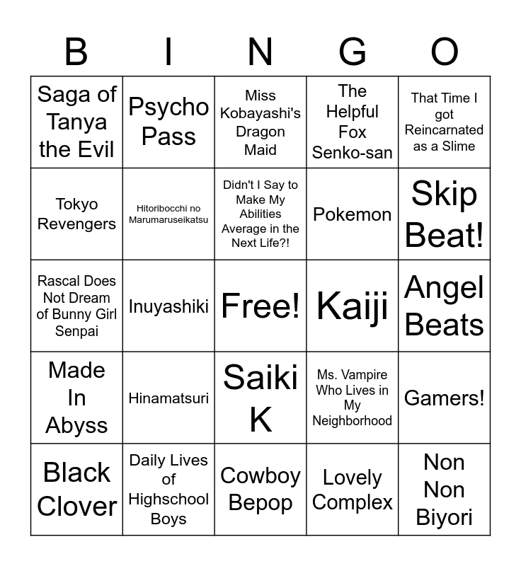This bingo card has a free space and 162 words: Jujutsu Kaisen, Sono Bisque Doll wa Koi wo Suru, Spy x Family, Given, Gunslinger Girl, Horimiya, Overlord, Kaguya-sama Love is War, So I'm a Spider, So What?, Samurai Champloo, Tokyo Revengers, Date A Live, Miss Kobayashi's Dragon Maid, Chio's School Road, Ms. Vampire Who Lives in My Neighborhood, The Misfit of Demon King Academy, BOFURI: I Don't Want to Get Hurt, so I'll Max Out My Defense, My Next Life as a Villainess: All Routes Lead to Doom!, The Quintessential Quintuplets, Wise Man's Grandchild, In Another World With My Smartphone, I've Been Killing Slimes For 300 Years And Maxed Out My Level, The Ancient Magus' Bride, The Devil is a Part-Timer!, Drug Store in Another World - The Slow Life of a Cheat Pharmacist, Isekai Cheat Magician, Saga of Tanya the Evil, Restaurant to Another World, Free! Iwatobi Swim Club, Banana Fish, SK8 The Infinity, Yuri On Ice, Cautious Hero: The Hero is Overpowered but Overly Cautious, High School Prodigies Have It Easy Even In Another World, Log Horizon, Domestic Girlfriend, Orange, The Way of the House Husband, Love Tyrant, My Little Monster, Skip Beat!, SKET Dance, Black Butler, How Heavy Are the Dumbbells You Lift?, Maoyuu Maou Yuusha, Akame Ga Kill!, Keijo!!!!!!!!, If It's for My Daughter, I'd Even Defeat a Demon Lord, Kuma Kuma Kuma Bear, No Game No Life, Asobi Asobase, In/Spectre, Id: Invaded, Bananya, Wolf Girl and Black Prince, Lovely Complex, How to Keep a Mummy, Magi, Magical Sempai, Kimi No Todoke, Non Non Biyori, Yona of the Dawn, Angel Beats, Hinamatsuri, Blend-S, Oreimo, Plastic Memories, My Roommate is a Cat, BTOOOM!, Daily Lives of Highschool Boys, Eromanga Sensei, Kaiji, Hitoribocchi no Marumaruseikatsu, Monthly Girls' Nozaki-Kun, K, Servant x Service, DRAMAtical Murder, Saki, Squid Girl, Didn't I Say to Make My Abilities Average in the Next Life?!, Sunday Without God, Attack on Titan, Komi-san, Doll's Frontline/Girl's Frontline, One Piece, Jobless Reincarnation, Mieruko-chan, Demon Slayer, Ranking of Kings, That Time I got Reincarnated as a Slime, The Great Jahy Will Not Be Defeated!, Madoka Magica, My Hero Academia, Vivy Fluorite Eye's Song, Megalo Box, The Promised Neverland, Re: Zero, Cells at Work, Neon Genesis Evangelion, Eye Shield 21, Yuru Camp△, Otherside Picnic, A Certain Scientific Railgun, Naruto, Pokemon, Black Clover, Rail Romanesque, Fire Force, Stein;sGate, Code Geass: Lelouch of the Rebellion, Full Metal Alchemist: Burgerhood, Hunter x Hunter, Dragon Ball Z, Violet Evergarden, Monogatari, Animegataris, Mob Psycho 100, One Punch Man, Cowboy Bepop, Great Teacher Onizuka, Serial Experiments Lain, Made In Abyss, Hajime no Ippo, nichijou, Gurren Lagann, Death Note, Haruhi Suzumiya, Jojo's Bizzare Adventure, Fate, A Place Further Than The Universe, Grand Blue, Psycho Pass, Shirobako, Dr. Stone, Rascal Does Not Dream of Bunny Girl Senpai, Ghost in the Shell, KonoSuba: God's Blessing on This Wonderful World!, Darling in the Franxx, Flip Flappers, Gamers!, New Game!, Gabriel Dropout, Gosick, Inuyashiki, Blood Blockade Battlefront, Recovery of an MMO Junkie, Saiki K, Panty & Stocking with Garterbelt, Princess Principal, Sword Art Online, Rising of the Shield Hero, Zombieland Saga, Re:Creators, The Helpful Fox Senko-san, Himouto! Umaru-chan, Dorohedoro, Girls und Panzer, Wotakoi: Love is Hard for Otaku, The God of Highschool, Tower of God, FLCL and Kakeguri.