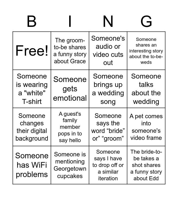 This bingo card has 16 words: Someone has WiFi problems, Someone is mentioning Georgetown cupcakes, Someone's audio or video cuts out, Someone shares an interesting story about the to-be-weds, Someone is wearing a "white" T-shirt, The groom-to-be shares a funny story about Grace, Someone says the word “bride” or” “groom”, A pet comes into someone's video frame, Free!, Someone gets emotional, Someone says I have to drop off or a similar iteration, Someone talks about the wedding, Someone changes their digital background, A guest's family member pops in to say hello, Someone brings up a wedding song and The bride-to-be takes a shot shares a funny story about Edd.