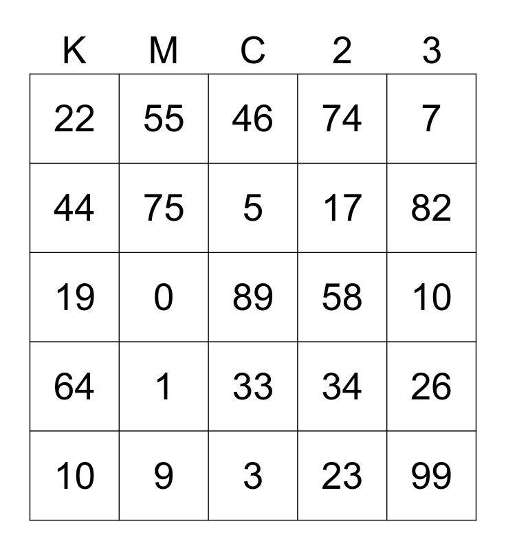This bingo card has 25 words: 1, 3, 5, 10, 7, 22, 44, 55, 58, 33, 17, 19, 34, 26, 75, 99, 10, 46, 82, 0, 89, 9, 64, 74 and 23.