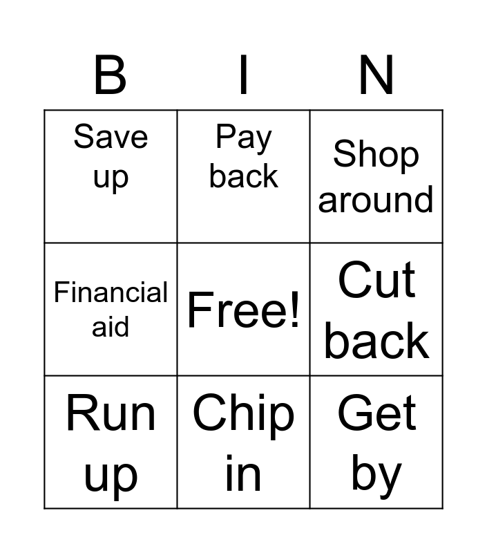 This bingo card has a free space and 20 words: Cut costs, Have money to burn, Shop around, Money can't buy love, Branch out, Get by, Money talks, Save up, Rip off, Pay back, Save it for a rainy day, Make ends meet, Cut back, Money doesn't grow on trees, Run up, Pour money down the drain, Chip in, Financial aid, Tighten your belt and Feel like a million bucks.