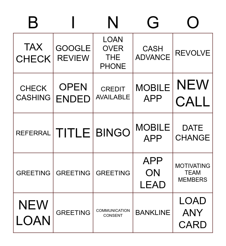 This bingo card has a free space and 24 words: NEW LOAN, GREETING, CREDIT AVAILABLE, BANKLINE, REVOLVE, TAX CHECK, GOOGLE REVIEW, LOAN OVER THE PHONE, MOBILE APP, DATE CHANGE, REFERRAL, OPEN ENDED, APP ON LEAD, MOTIVATING TEAM MEMBERS, CHECK CASHING, GREETING, COMMUNICATION CONSENT, CASH ADVANCE, NEW CALL, GREETING, TITLE, GREETING, MOBILE APP and LOAD ANY CARD.