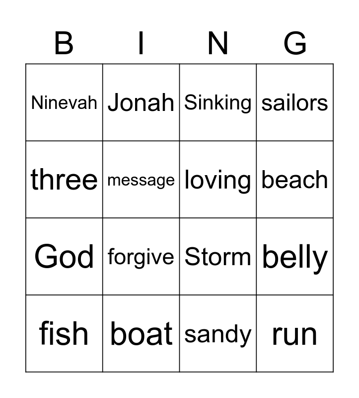 This bingo card has 16 words: fish, boat, Sinking, sailors, three, Jonah, Storm, belly, Ninevah, message, sandy, beach, God, forgive, loving and run.