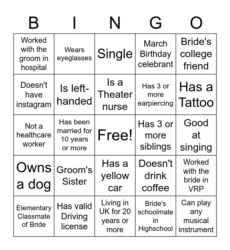 This bingo card has a free space and 24 words: Elementary Classmate of Bride, Groom's Sister, Is a Theater nurse, Bride's schoolmate in Highschool, Bride's college friend, Worked with the groom in hospital, Wears eyeglasses, Single, Has 3 or more siblings, Good at singing, Not a healthcare worker, Is left-handed, Doesn't drink coffee, Worked with the bride in VRP, Doesn't have instagram, Has valid Driving license, Living in UK for 20 years or more, March Birthday celebrant, Has a Tattoo, Owns a dog, Has been married for 10 years or more, Has a yellow car, Has 3 or more earpiercing and Can play any musical instrument.
