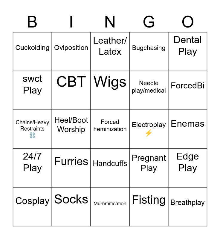 This bingo card has a free space and 24 words: Furries, Socks, Wigs, Cosplay, Dental Play, Cuckolding, swct Play, Oviposition, Electroplay ⚡️, Handcuffs, Needle play/medical, Chains/Heavy Restraints ⛓, Pregnant Play, Edge Play, CBT, Fisting, Enemas, Leather/ Latex, ForcedBi, Heel/Boot Worship, Breathplay, 24/7 Play, Bugchasing and Mummification.