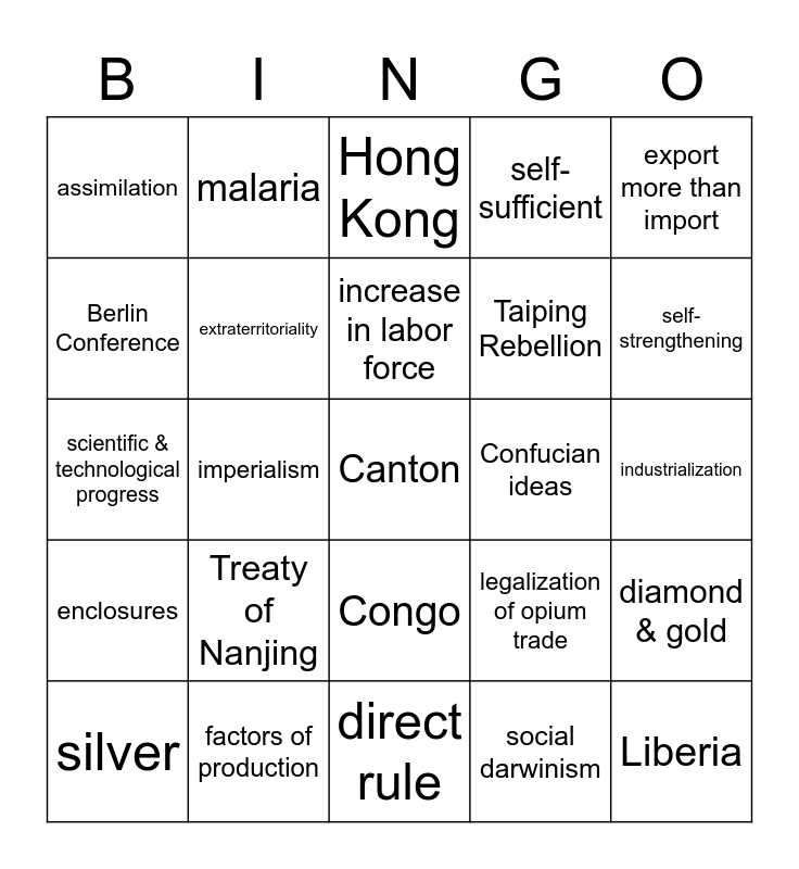 This bingo card has 40 words: indirect rule, scientific & technological progress, opium, extraterritoriality, factors of production, Congo, increase in labor force, protectorate, export more than import, enclosures, imperialism, self-sufficient, Canton, industrialization, Confucian ideas, Treaty of Nanjing, disunity among Africans, assimilation, crop rotation, Hong Kong, diamond & gold, social darwinism, Taiping Rebellion, Berlin Conference, steam engine, sphere of influence, geography of Africa, scramble for Africa, Liberia, Otto von Bismarck, Qing, silver, blockade, legalization of opium trade, self-strengthening, direct rule, White man's burden, selective breeding, malaria and natural resources.