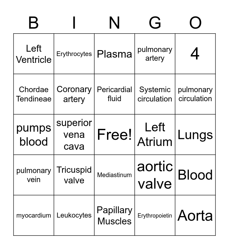 This bingo card has a free space and 39 words: Atria, Ventricles, Pericardium, Coronary artery, myocardium, Mediastinum, Pericardial fluid, Endocardium, 4, pulmonary vein, superior vena cava, pulmonary artery, Aorta, Lungs, Left Atrium, Tricuspid valve, Mitral valve, Left Ventricle, interventricular sulcus, aortic valve, Chordae Tendineae, Papillary Muscles, Systemic circulation, pulmonary circulation, Heart Attack, Epicardium, septum, cusps, apex, Erythrocytes, Hemoglobin, capillaries, Plasma, Leukocytes, Erythropoietin, Bone Marrow, Blood, pumps blood and mitral regurgitation.