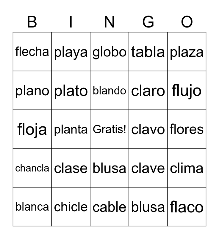 This bingo card has a free space and 29 words: blanca, bloque, planta, plancha, flecha, globo, plato, clase, clavo, chicle, flores, flaco, cable, blusa, flujo, pluma, blusa, chancla, plaza, floja, clave, habla, claro, plano, tabla, playa, clima, blando and iglu.