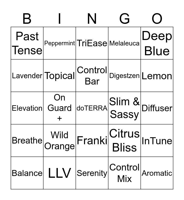 This bingo card has a free space and 24 words: Wild Orange, LLV, Control Bar, Balance, Deep Blue, Past Tense, Lavender, Peppermint, Slim & Sassy, Franki, Digestzen, Elevation, Citrus Bliss, InTune, Topical, Control Mix, Diffuser, TriEase, Lemon, On Guard +, Aromatic, Breathe, Melaleuca and Serenity.