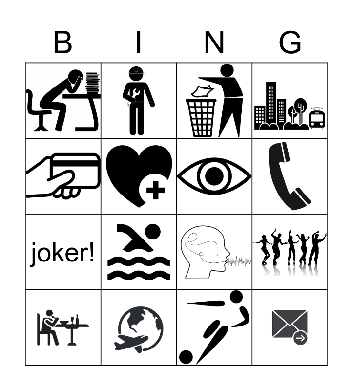 This bingo card has 19 images and 1 words: joker!.