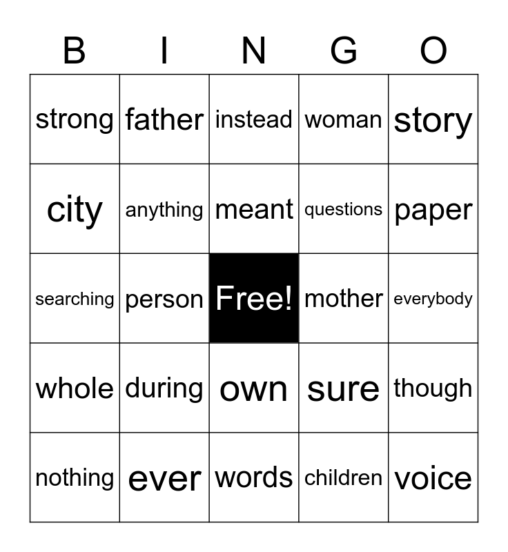 This bingo card has a free space and 24 words: during, ever, meant, nothing, story, strong, city, father, mother, own, questions, searching, sure, though, anything, children, everybody, instead, paper, person, voice, whole, woman and words.