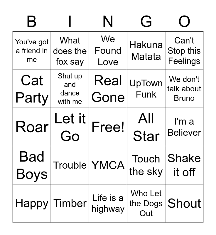 This bingo card has a free space and 24 words: Trouble, Timber, Real Gone, Happy, Can't Stop this Feelings, You've got a friend in me, Cat Party, What does the fox say, All Star, YMCA, UpTown Funk, Roar, Touch the sky, Shake it off, Shut up and dance with me, Who Let the Dogs Out, I'm a Believer, We Found Love, We don't talk about Bruno, Let it Go, Shout, Bad Boys, Hakuna Matata and Life is a highway.