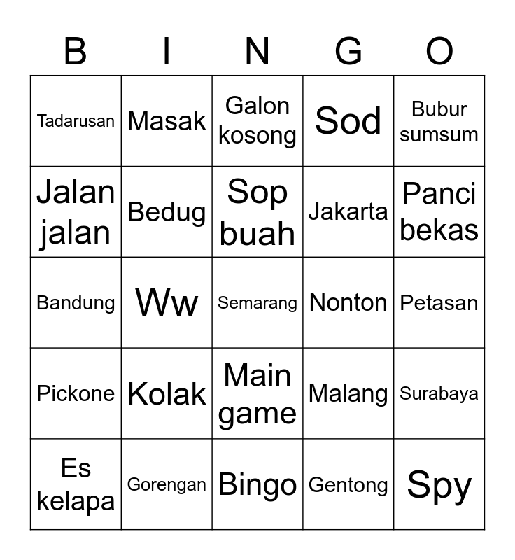 This bingo card has a free space and 24 words: Kolak, Gorengan, Sop buah, Es kelapa, Bubur sumsum, Tadarusan, Jalan jalan, Masak, Nonton, Main game, Jakarta, Bandung, Malang, Surabaya, Bedug, Gentong, Petasan, Galon kosong, Panci bekas, Ww, Spy, Pickone, Sod and Bingo.