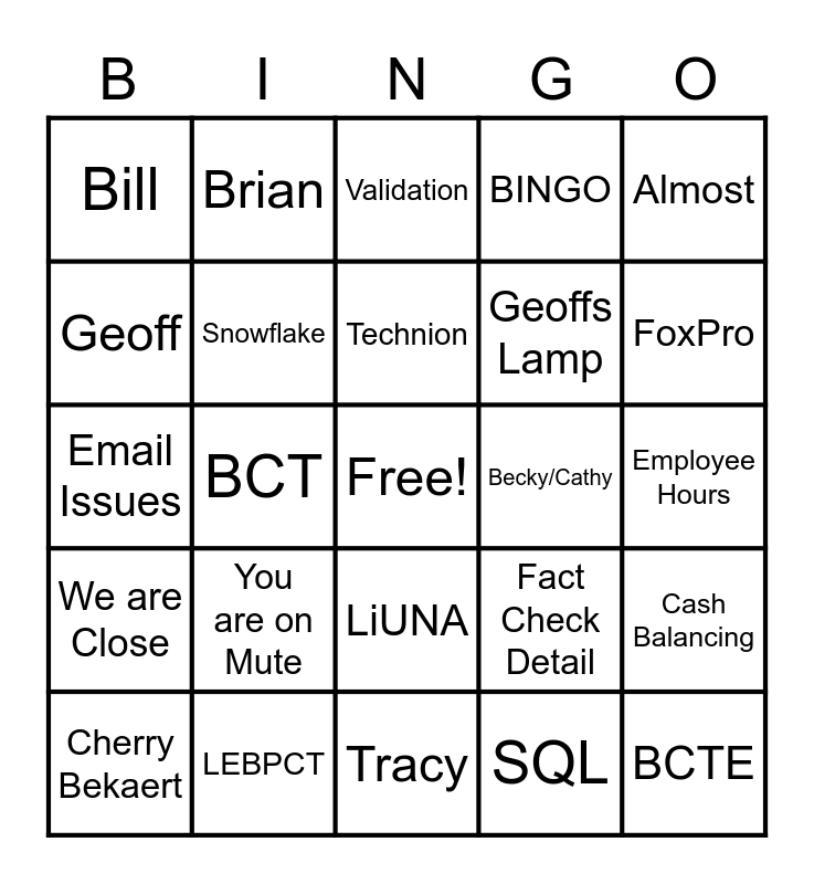 This bingo card has a free space and 24 words: You are on Mute, LEBPCT, Technion, Cherry Bekaert, Almost, Bill, Geoff, Brian, Becky/Cathy, LiUNA, Geoffs Lamp, Email Issues, Fact Check Detail, Cash Balancing, Snowflake, SQL, Employee Hours, Validation, FoxPro, BCT, BCTE, We are Close, BINGO and Tracy.