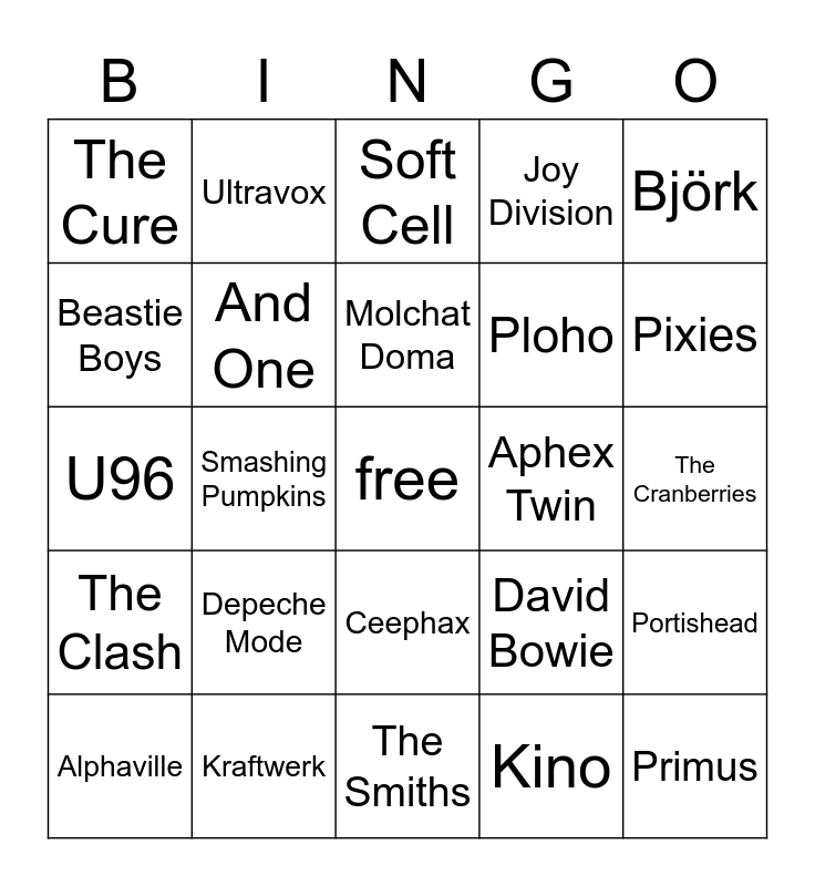 This bingo card has a free space and 24 words: Depeche Mode, Kraftwerk, Molchat Doma, Alphaville, Björk, The Cure, Beastie Boys, Ultravox, Aphex Twin, Ceephax, Ploho, U96, David Bowie, Portishead, And One, Kino, The Cranberries, Soft Cell, Pixies, Smashing Pumpkins, Primus, The Clash, Joy Division and The Smiths.