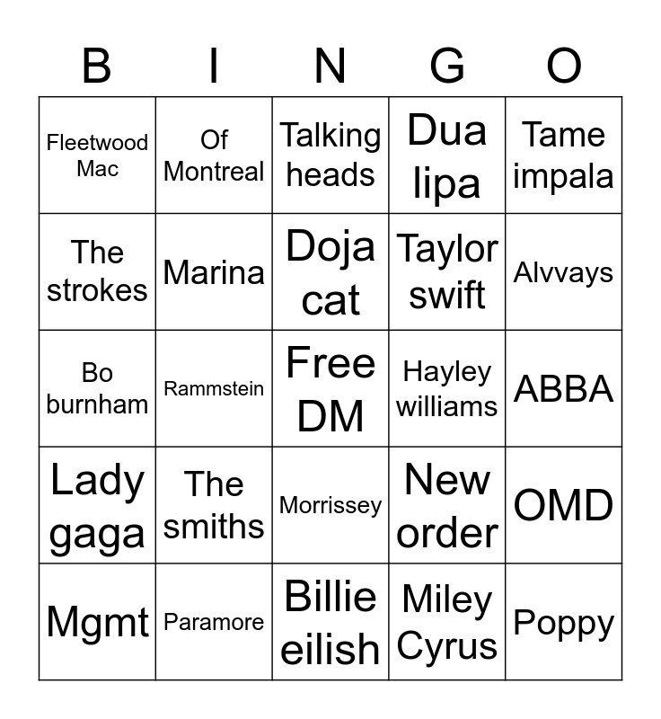 This bingo card has a free space and 24 words: The smiths, Paramore, Doja cat, Mgmt, Tame impala, Fleetwood Mac, The strokes, Of Montreal, Hayley williams, Morrissey, Taylor swift, Bo burnham, New order, OMD, Marina, Miley Cyrus, ABBA, Talking heads, Alvvays, Rammstein, Poppy, Lady gaga, Dua lipa and Billie eilish.