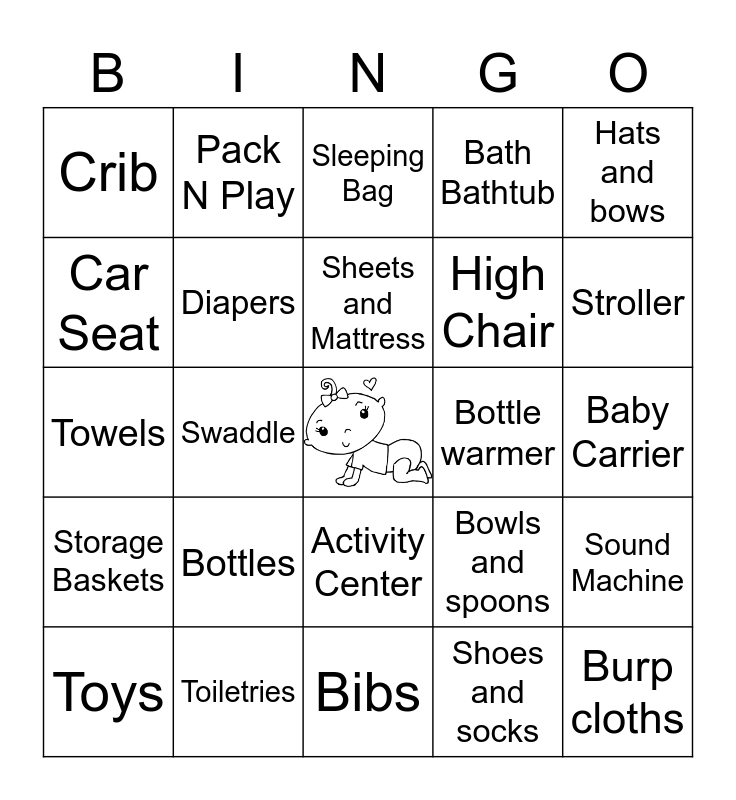 This bingo card has a free space and 29 words: Toys, Teething Rings, Swaddle, Changing basket/pad, Crib, Sleeping Bag, Diapers, Bottles, Bottle warmer, Toiletries, Baby Carrier, Burp cloths, Bibs, Shoes and socks, Stroller, Baby Bouncer, Activity Center, Storage Baskets, Hats and bows, Towels, Bowls and spoons, Clothing, High Chair, Car Seat, Bath Bathtub, Pack N Play, Sound Machine, Sheets and Mattress and Bottle sterilizer.