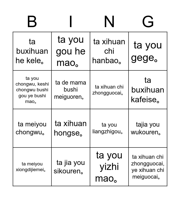 This bingo card has 16 words: ta jia you sikouren。, tajia you wukouren。, ta xihuan chi hanbao。, ta buxihuan he kele。, ta meiyou chongwu。, ta you gou he mao。, ta you liangzhigou。, ta you yizhi mao。, ta you chongwu, keshi chongwu bushi gou ye bushi mao。, ta de mama bushi meiguoren。, ta meiyou xiongdijiemei。, ta you gege。, ta xihuan hongse。, ta buxihuan kafeise。, ta xihuan chi zhongguocai。 and ta xihuan chi zhongguocai, ye xihuan chi meiguocai。.