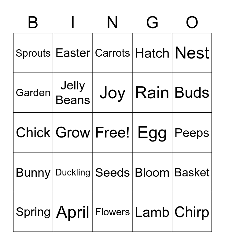 This bingo card has a free space and 24 words: Duckling, April, Joy, Spring, Nest, Sprouts, Garden, Easter, Egg, Seeds, Rain, Chick, Bloom, Basket, Jelly Beans, Lamb, Peeps, Carrots, Buds, Grow, Chirp, Bunny, Hatch and Flowers.