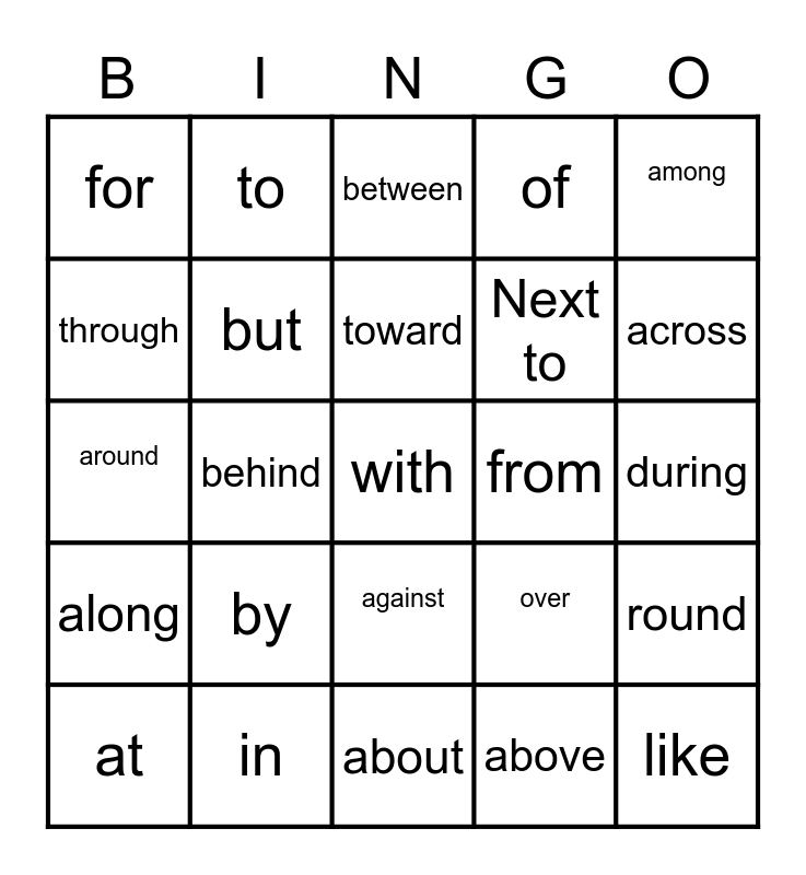 This bingo card has a free space and 29 words: at, before, behind, except, for, between, but, by, from, in, during, like, about, above, across, after, against, along, among, around, over, past, Next to, through, of, to, round, toward and underneath.