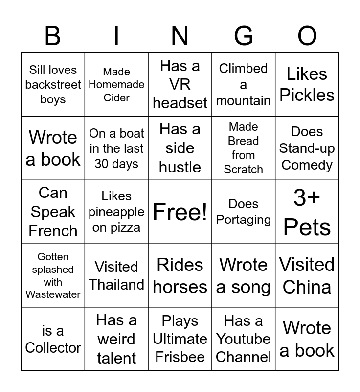 This bingo card has a free space and 25 words: Visited Thailand, Plays Ultimate Frisbee, Has a side hustle, is a Collector, Likes Pickles, Sill loves backstreet boys, Wrote a book, Made Homemade Cider, Does Portaging, Rides horses, Made Bread from Scratch, Can Speak French, Wrote a song, Visited China, On a boat in the last 30 days, Has a tattoo, 3+ Pets, Has a VR headset, Does Stand-up Comedy, Likes pineapple on pizza, Wrote a book, Has a weird talent, Gotten splashed with Wastewater, Climbed a mountain and Has a Youtube Channel.