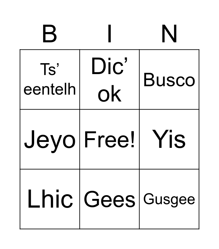 This bingo card has a free space and 26 words: Talok, Beet, Gees, Dik’ iy, Gusgee, Ts’ eentelh, Yis, Dic’ ok, Tsalic, Cineeyh, Negisjee, Nustel, C’ adeeyh, C’ ilhgik, Dlunco, Khida, Jeyo, Nelto’, Busco, Cas, Sis, Misdus, Hiztl’ iyh, Leegok, Lhic and Bus.