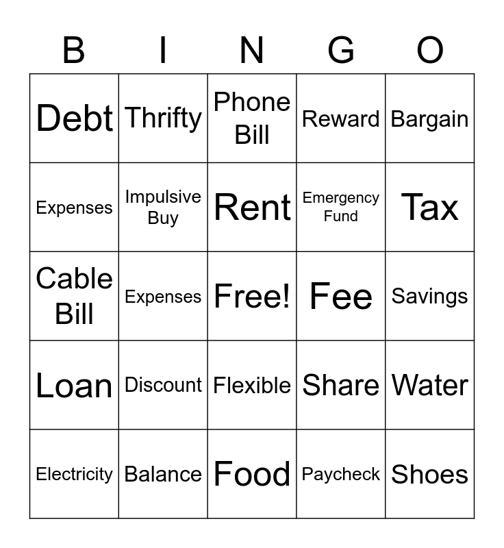 This bingo card has a free space and 24 words: Discount, Balance, Rent, Electricity, Bargain, Debt, Expenses, Thrifty, Fee, Flexible, Emergency Fund, Cable Bill, Share, Water, Impulsive Buy, Paycheck, Savings, Phone Bill, Tax, Expenses, Shoes, Loan, Reward and Food.
