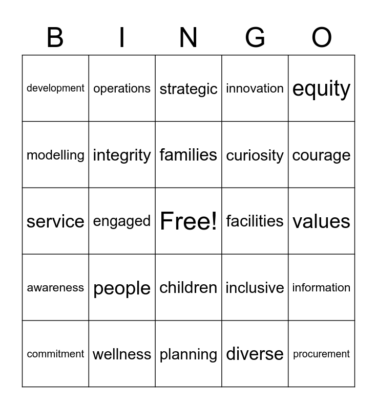 This bingo card has a free space and 47 words: province, procurement, pride, planning, people, passion, operations, modern, modelling, ministry, integrity, innovation, information, inclusive, government, finance, families, facilities, excellence, equity, engaged, diverse, development, curiosity, culture, courage, commitment, collaboration, children, awareness, assets, analysis, agility, accountability, accessibility, wellness, values, trusted, trust, teamwork, talented, strategic, service, sensitivity, safety, reconciliation and recognition.