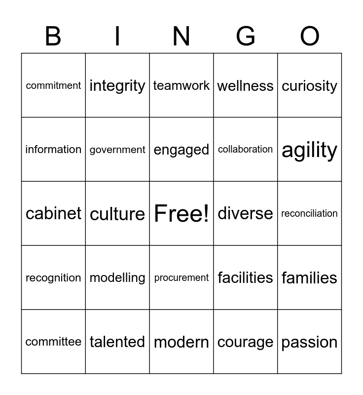 This bingo card has a free space and 52 words: people, passion, operations, modern, modelling, ministry, integrity, innovation, information, inclusive, government, finance, families, facilities, excellence, equity, engaged, diverse, development, curiosity, culture, courage, commitment, collaboration, children, awareness, assets, analysis, agility, accountability, accessibility, wellness, values, trusted, trust, teamwork, talented, strategic, service, sensitivity, safety, reconciliation, recognition, province, procurement, pride, planning, cabinet, council, advisory, committee and project.