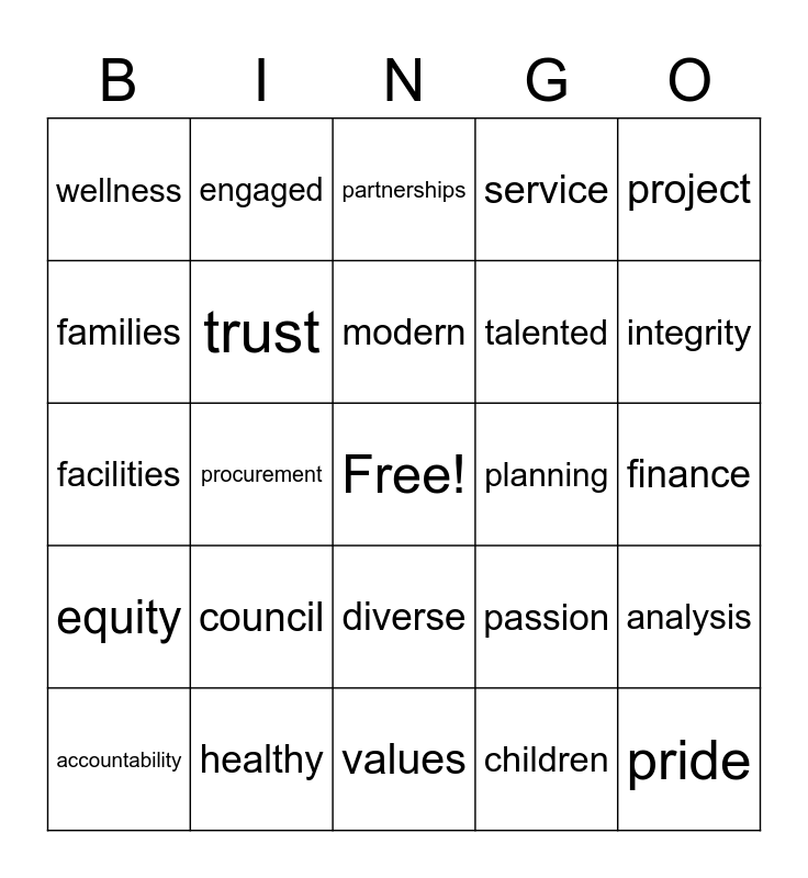 This bingo card has a free space and 56 words: advisory, accountability, accessibility, wellness, values, trusted, trust, teamwork, talented, strategic, service, sensitivity, safety, reconciliation, recognition, province, project, procurement, processes, pride, planning, people, passion, partnerships, operations, modern, modelling, ministry, integrity, innovation, information, minister, inclusive, government, finance, families, facilities, excellence, equity, engaged, diverse, development, curiosity, culture, courage, council, healthy, committee, commitment, collaboration, children, cabinet, awareness, assets, analysis and agility.