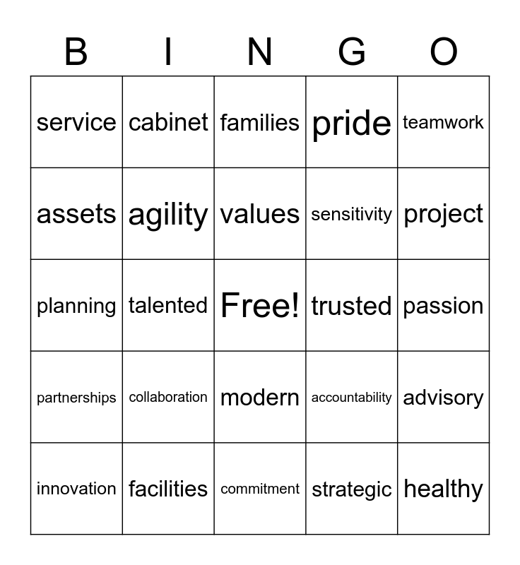 This bingo card has a free space and 52 words: council, healthy, committee, commitment, collaboration, children, cabinet, awareness, assets, analysis, agility, respect, advisory, accountability, accessibility, wellness, values, trusted, trust, teamwork, talented, strategic, service, sensitivity, safety, reconciliation, recognition, province, project, procurement, processes, pride, inclusive, government, finance, families, facilities, excellence, equity, engaged, diverse, passion, partnerships, operations, modern, modelling, ministry, planning, people, integrity, innovation and information.