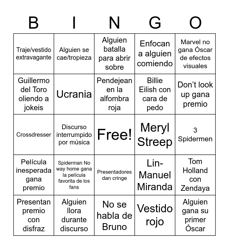 This bingo card has a free space and 30 words: Alguien llora durante discurso, Más de 3 personas suben a aceptar un premio, Discurso interrumpido por música, Grosería, Traje/vestido extravagante, Alguien batalla para abrir sobre, Ucrania, Presentadores dan cringe, Meryl Streep, No se habla de Bruno, 3 Spidermen, Alguien gana su primer Óscar, Vestido rojo, Habla español (discurso en otro idioma), Don’t look up gana premio, Película gana más de 3 premios, Lin-Manuel Miranda, Película inesperada gana premio, Spiderman No way home gana la película favorita de los fans, Marvel no gana Óscar de efectos visuales, Crossdresser, Lengua de señas, Alguien se cae/tropieza, Billie Eilish con cara de pedo, Guillermo del Toro oliendo a jokeis, Enfocan a alguien comiendo, Tom Holland con Zendaya, Presentan premio con disfraz, Pendejean en la alfombra roja and Nadie le atina a una nominación en el bingo.