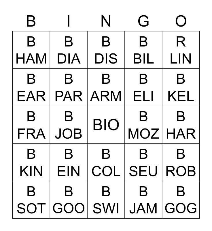 This bingo card has a free space and 29 words: B SOT, B ROW, B JOB, B CUR, B HAM, B DIS, B PAR, B EIN, B MOZ, B GOO, B HAR, B GOG, B SWI, B JAM, B KEL, B SIW, B COL, B KIN, R LIN, B FRA, B SEU, B KAH, B ELI, B EAR, B BIL, B DIA, B ROB, B ARM and B BRA.
