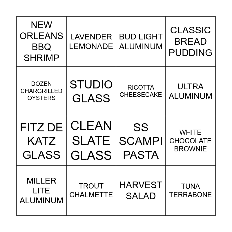 This bingo card has 16 words: TROUT CHALMETTE, WHITE CHOCOLATE BROWNIE, BUD LIGHT ALUMINUM, NEW ORLEANS BBQ SHRIMP, FITZ DE KATZ GLASS, LAVENDER LEMONADE, SS SCAMPI PASTA, HARVEST SALAD, DOZEN CHARGRILLED OYSTERS, STUDIO GLASS, MILLER LITE ALUMINUM, CLASSIC BREAD PUDDING, CLEAN SLATE GLASS, ULTRA ALUMINUM, RICOTTA CHEESECAKE and TUNA TERRABONE.
