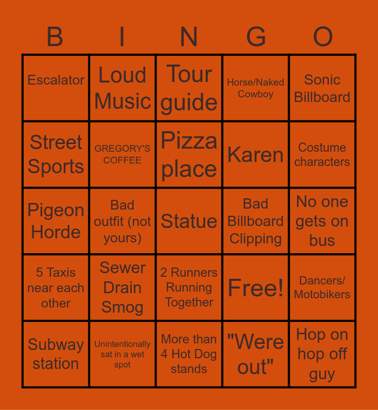 This bingo card has 25 words: Sewer Drain Smog, More than 4 Hot Dog stands, Pizza place, Subway station, Sonic Billboard, Escalator, Street Sports, Loud Music, Bad Billboard Clipping, 2 Runners Running Together, Karen, Pigeon Horde, Free!, Dancers/ Motobikers, GREGORY'S COFFEE, Hop on hop off guy, No one gets on bus, Tour guide, Costume characters, Bad outfit (not yours), Statue, Unintentionally sat in a wet spot, 5 Taxis near each other, Horse/Naked Cowboy and "Were out".