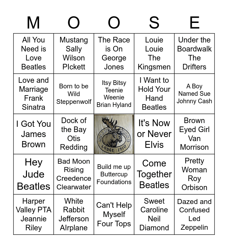 This bingo card has a free space and 69 words: Save the Last Dance The Drifters, I'm a Believer The Monkees, You Can't Hurry Love The Surpremes, The Twist Chubby Checker, Brown Eyed Girl Van Morrison, My Girl The Temptations, Born to be Wild Steppenwolf, Everyday People Sly & the Family Stone, I Want to Hold Your Hand Beatles, Fortunate Son Creedence Clearwater, Hey Jude Beatles, God Only Knows Beach Boys, Louie Louie The Kingsmen, Under the Boardwalk The Drifters, Will You Love Me Tomorrow? The Shirelles, Bad Moon Rising Creedence Clearwater, Itsy Bitsy Teenie Weenie Brian Hyland, It's Now or Never Elvis, Stop in the Name of Love The Supremes, I Got You James Brown, White Rabbit Jefferson AIrplane, Can't Help Myself Four Tops, Come Together Beatles, Satisfaction Rolling Stones, These Boots are Made.. Nancy Sinatra, Aquarius The 5th Dimension, Wouldn't it be Nice Beach Boys, You Really Got Me Kinks, Dazed and Confused Led Zeppelin, The Sound of Silence Simon & Garfunkel, Mustang Sally Wilson PIckett, Tossin and Turnin Bobby Lewis, Daydream Believer The Monkees, Can't Help Falling in Love Elvis, Hang on Sloopy The McCoys, You've Lost that Lovin Feeling Righteous Bros., Time of the Season Zombies, King of the Road Roger Miller, A Boy Named Sue Johnny Cash, Harper Valley PTA Jeannie Riley, Ring of Fire Johnny Cash, The Race is On George Jones, Sweet Caroline Neil Diamond, Shout Otis Day, Twist and Shout Beatles, My Girl Temptations, Build me up Buttercup Foundations, Stand by Me Ben E King, Fly me to the Moon Frank Sinatra, All You Need is Love Beatles, Dock of the Bay Otis Redding, Respect Aretha Franklin, Runaround Sue Dion, Pretty Woman Roy Orbison, I Want You Back Jackson 5, Sugar Sugar The Archies, I Got You Babe Sonny & Cher, Happy Together Turtles, Beyond the Sea Bobby Darin, Love and Marriage Frank Sinatra, Ain't that a Kick in the Head Dean Martin, Under the Boardwalk Drifters, Chapel of Love Dixie Cups, Dance to the Music Sly & the Family Stone, It's not Unusual Tom Jones, Heard it thru the Grapevine Marvin Gaye, Then He Kissed Me Crystals, Barbara Ann Beach Boys and Chain of Fools Aretha Franklin.
