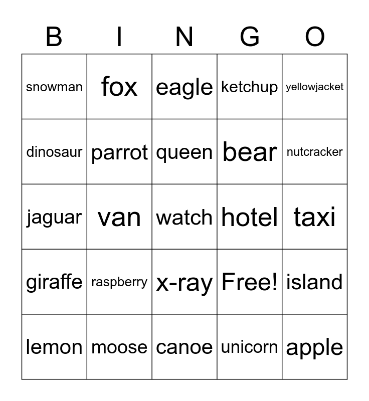This bingo card has 27 words: Free!, apple, bear, canoe, dinosaur, eagle, fox, giraffe, hotel, island, jaguar, ketchup, lemon, moose, nutcracker, orange, parrot, queen, raspberry, snowman, taxi, unicorn, van, watch, x-ray, yellowjacket and zucchini.