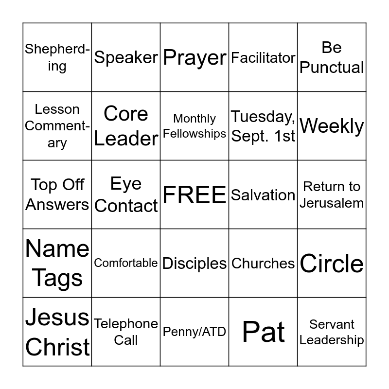 This bingo card has a free space and 24 words: Comfortable, Telephone Call, Monthly Fellowships, Jesus Christ, Be Punctual, Shepherd-ing, Lesson Comment-ary, Speaker, Salvation, Disciples, Tuesday, Sept. 1st, Top Off Answers, Churches, Circle, Core Leader, Pat, Return to Jerusalem, Prayer, Weekly, Eye Contact, Servant Leadership, Name Tags, Facilitator and Penny/ATD.