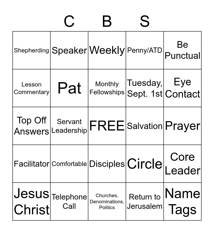 This bingo card has a free space and 24 words: Comfortable, Telephone Call, Monthly Fellowships, Jesus Christ, Be Punctual, Shepherding, Lesson Commentary, Speaker, Salvation, Disciples, Tuesday, Sept. 1st, Top Off Answers, Circle, Core Leader, Pat, Return to Jerusalem, Prayer, Weekly, Eye Contact, Servant Leadership, Name Tags, Facilitator, Penny/ATD and Churches, Denominations, Politics.