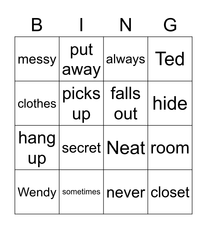 This bingo card has 16 words: sometimes, room, always, messy, hang up, put away, Neat, never, clothes, picks up, Wendy, Ted, secret, hide, falls out and closet.