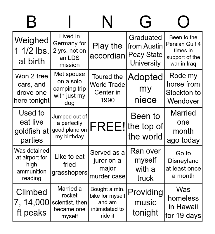 This bingo card has a free space and 24 words: Like to eat fried grasshopers, Married a rocket scientist, then became one myself, Toured the World Trade Center in 1990, Climbed 7, 14,000 ft peaks, Been to the Persian Gulf 4 times in support of the war in Iraq, Weighed 1 1/2 lbs. at birth, Won 2 free cars, and drove one here tonight, Lived in Germany for 2 yrs. not on an LDS mission, Been to the top of the world, Served as a juror on a major murder case, Adopted my niece, Used to eat live goldfish at parties, Ran over myself with a truck, Go to Disneyland at least once a month, Met spouse on a solo camping trip with just my dog, Providing music tonight, Married one month ago today, Play the accordian, Rode my horse from Stockton to Wendover, Jumped out of a perfectly good plane on my birthday, Was homeless in Hawaii for 19 days, Was detained at airport for high ammunition reading, Graduated from Austin Peay State University and Bought a mtn. bike for myself and am intimidated to ride it.