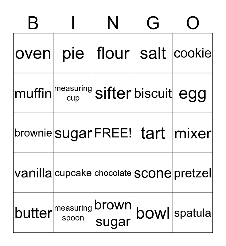 This bingo card has a free space and 24 words: cupcake, measuring spoon, sifter, butter, cookie, oven, muffin, pie, tart, chocolate, biscuit, brownie, scone, pretzel, measuring cup, bowl, mixer, flour, egg, sugar, spatula, vanilla, salt and brown sugar.