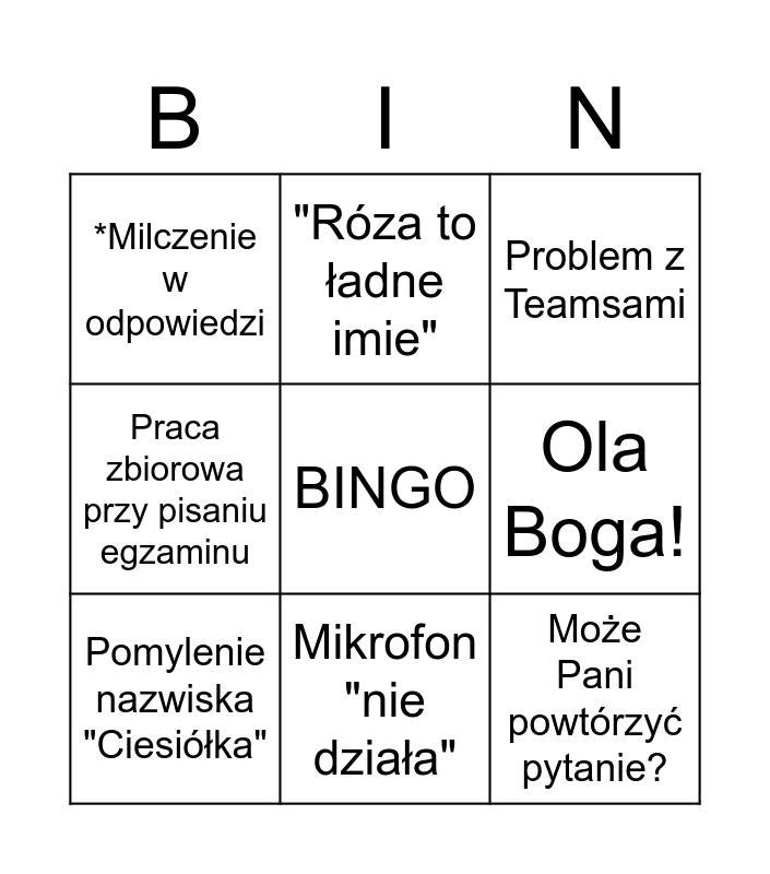 This bingo card has a free space and 8 words: Ola Boga!, Problem z Teamsami, "Róza to ładne imie", Pomylenie nazwiska "Ciesiółka", *Milczenie w odpowiedzi, Może Pani powtórzyć pytanie?, Praca zbiorowa przy pisaniu egzaminu and Mikrofon "nie działa".