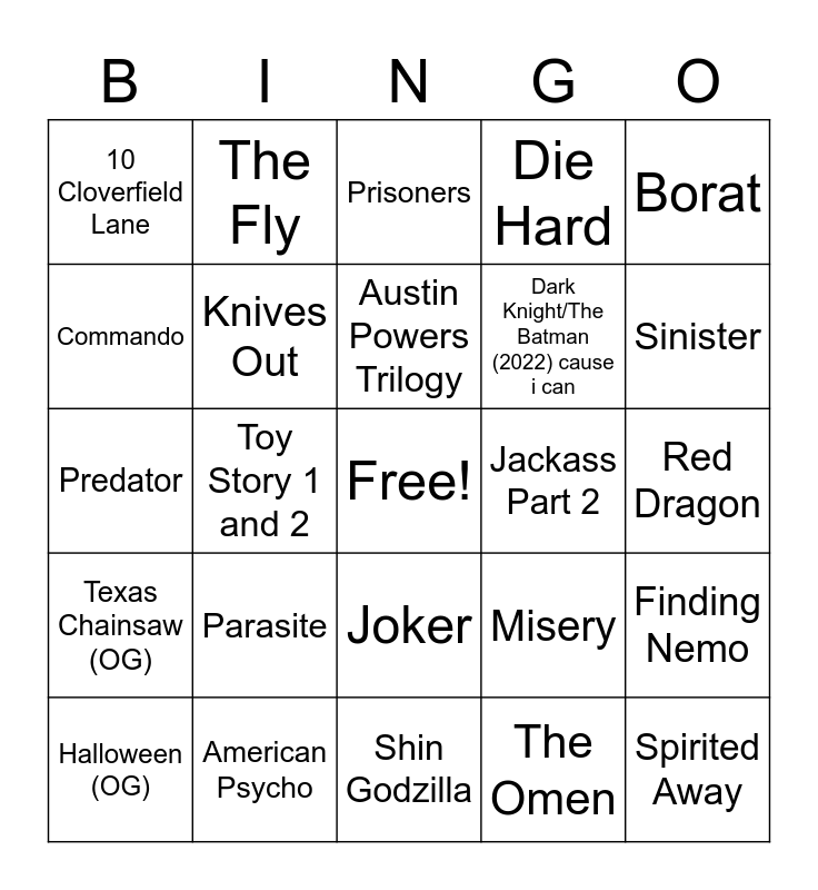 This bingo card has a free space and 24 words: Parasite, American Psycho, Austin Powers Trilogy, Halloween (OG), Borat, 10 Cloverfield Lane, Commando, The Fly, Jackass Part 2, Joker, Dark Knight/The Batman (2022) cause i can, Predator, Misery, Finding Nemo, Knives Out, The Omen, Red Dragon, Prisoners, Sinister, Toy Story 1 and 2, Spirited Away, Texas Chainsaw (OG), Die Hard and Shin Godzilla.