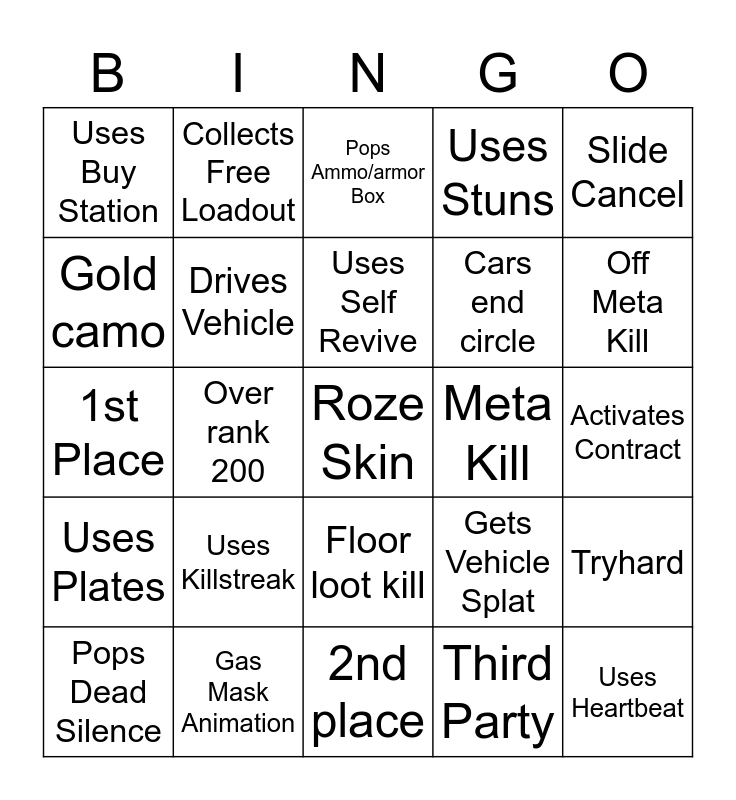 This bingo card has a free space and 34 words: Uses Zipline, Third Party, Has Armor Satchel, Uses Parachute, Uses Plates, Drives Vehicle, Slide Cancel, Pops Dead Silence, Collects Free Loadout, Uses Lethal Equipment, Uses Self Revive, Pops Ammo/armor Box, 3 kills, Opens or Closes Door, Meta Kill, Off Meta Kill, Gas Mask Animation, 1st Place, Uses Killstreak, Gets Vehicle Splat, Floor loot kill, Camping, Uses Buy Station, Activates Contract, 2nd place, Uses Heartbeat, Uses Stuns, RPG user, Cars end circle, Gold camo, Roze, Over rank 200, Tryhard and Blueprint in loadout.