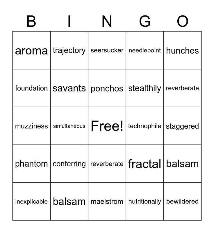 This bingo card has a free space and 24 words: conferring, balsam, ponchos, inexplicable, hunches, aroma, foundation, trajectory, technophile, reverberate, stealthily, muzziness, fractal, balsam, savants, nutritionally, staggered, seersucker, reverberate, simultaneous, bewildered, phantom, needlepoint and maelstrom.