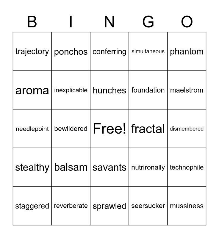 This bingo card has a free space and 24 words: balsam, reverberate, hunches, staggered, phantom, trajectory, aroma, ponchos, fractal, savants, foundation, needlepoint, nutrironally, technophile, inexplicable, seersucker, dismembered, conferring, maelstrom, bewildered, mussiness, stealthy, simultaneous and sprawled.